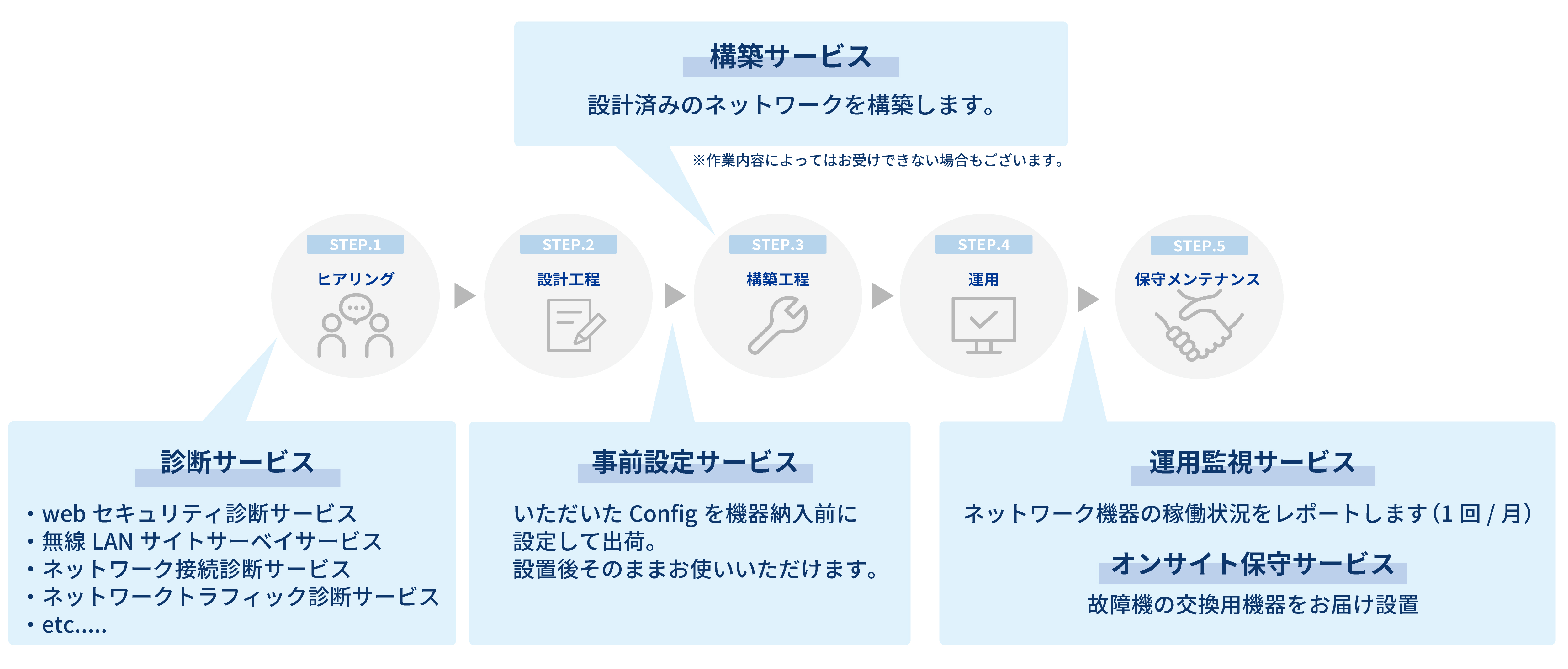 ネットワーク診断からネットワーク設計、セキュリティ対策、構築・導入、LAN工事・施工、運用サポート、研修プログラムまで ネットワークに関わるあらゆるご相談をワンストップでお受けするサービスです。 |