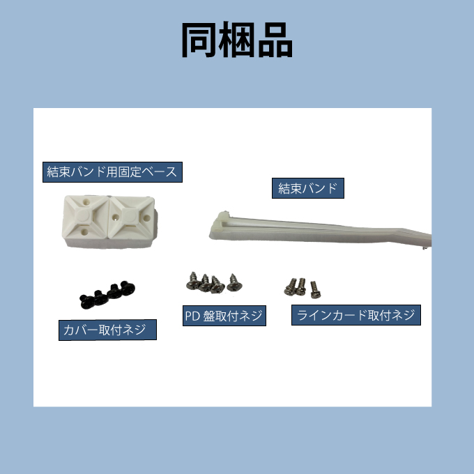 | 同梱物 | インストレーションガイド& 保証書×1部 カバー取付ネジ4個 ラインカード取付ネジ3個 PD盤取付用ネジ4個 結束バンド2個 結束バンド用固定ベース2個 |