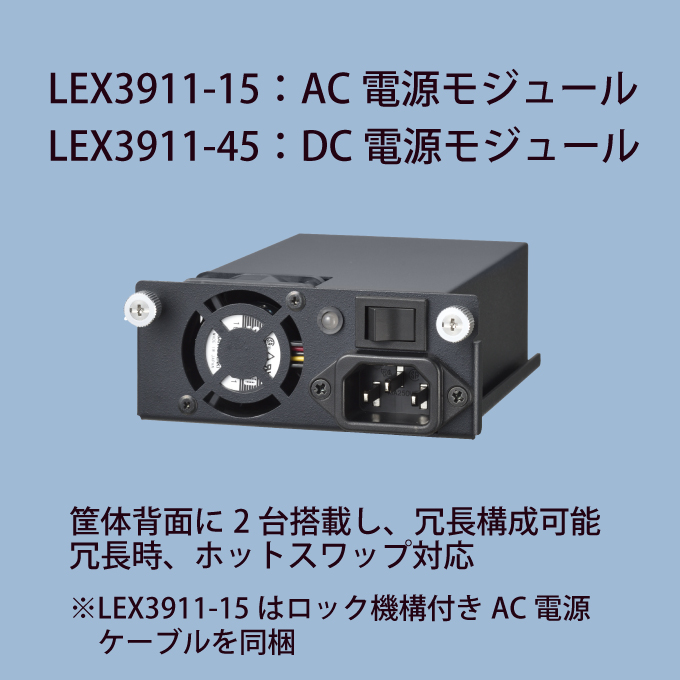 LEX3911-15/LEX3911-45は、LEX3004用の電源モジュールで、AC電源、DC電源の2タイプをラインアップ。筐体背面には2台まで電源モジュールを搭載することができ、冗長構成をとることが可能です。電源モジュールは、自動速度制御機能付冷却用FANと一体型になっています。電源とFANの動作状態は「LEX3004」の前面のLEDで確認できます。