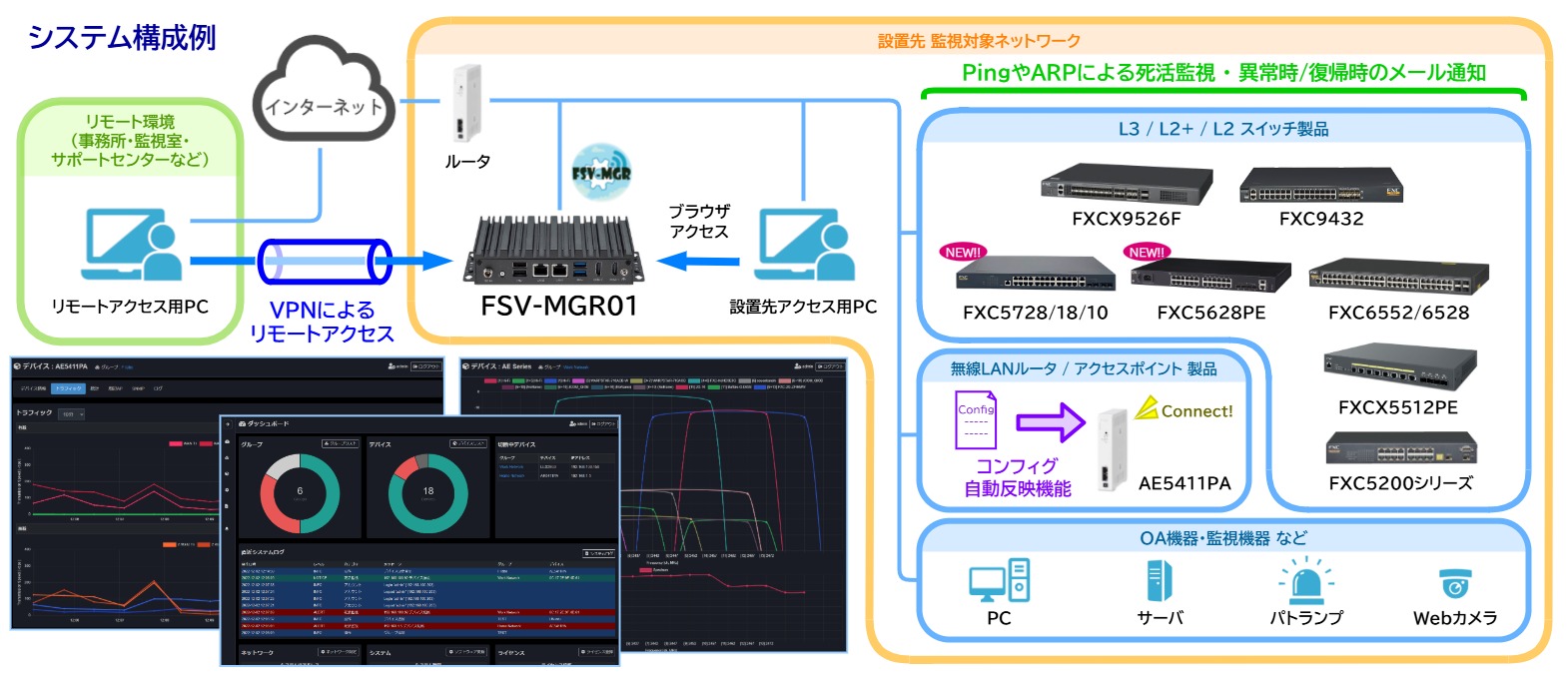 対応機器 | [無線アクセスポイント]AE5411PA 他、一部AE1000シリーズ [L3スイッチ] FXCX9526F, FXC9432 [L2+スイッチ] FXCX5512PE, FXCX6552, FXC6528 [L2スイッチ] FXC5210(PE), FXC5218(PE), FXC5224(PE) FXC5710, FXC5718, FXC5728, FXC5628PE ※上記対応製品以外でも、IPを持ったデバイス(ネットワーク機器・PC等)であれば 死活監視やSNMPなど一部機能に対応 |