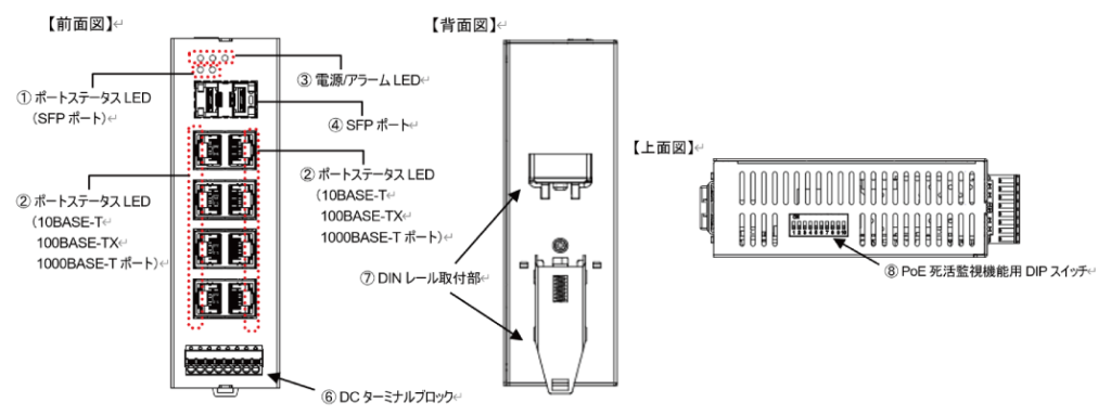 | DIPスイッチ | [No1-8] オン: PoE死活監視が有効 オフ: PoE死活監視が無効 [No9] オン:PDリンクアップ開始から5分後にPoE死活監視を開始 オフ:PDリンクアップ開始から10分後にPoE死活監視を開始 [No10]未使用 ※DIP スイッチは、本機器の電源投入されている場合には変更が反映されません。電源をオフにして操作すると反映されます。 |