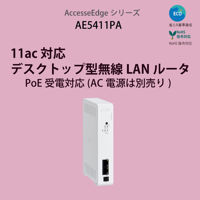 AE5411PAは、2.4GHz帯域でIEEE802.11b/g/n、5GHz帯域で、IEEE802.11a/n/acをサポートするPoE/AC給電に対応したオフィス向け無線LANルータです。