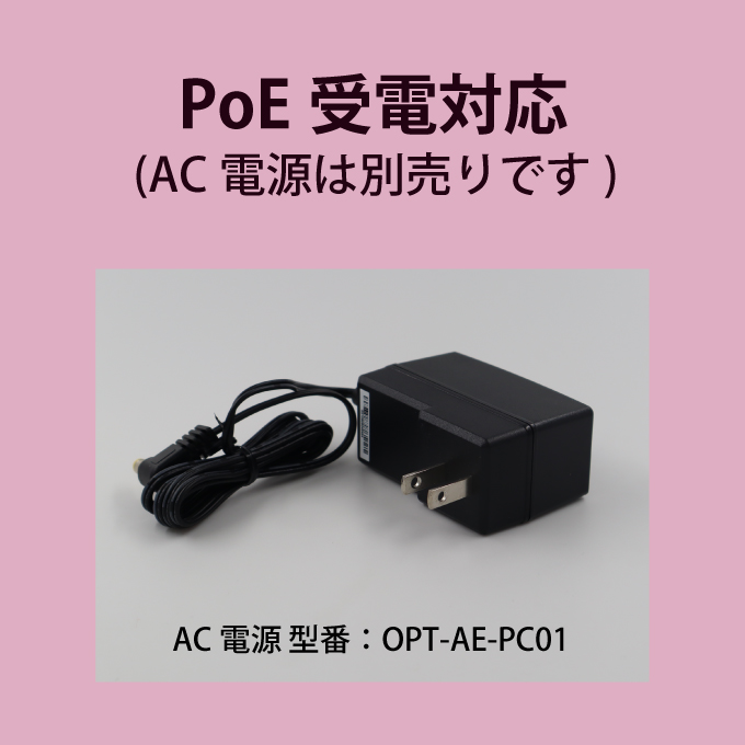 - 電源供給方法はIEEE802.3af 受電またはオプションにてACアダプター対応