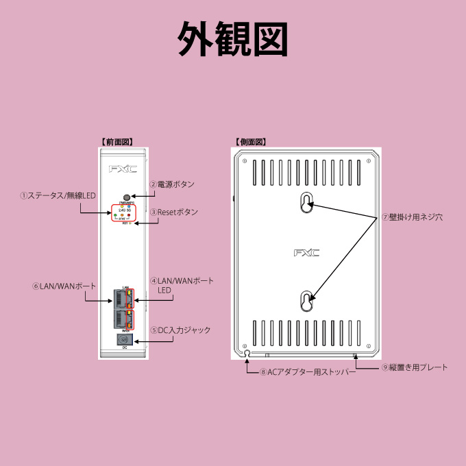 | LED/ステータスLED | 起動(緑点灯)、電源OFF(消灯)、起動中(緑点滅)、 WPS 動作中(橙点滅)、工場出荷リセット(赤点滅→消灯) F/W更新中(赤緑橙ローテーション) |