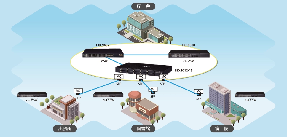 庁舎(宅側)から離れた各拠点(出張所、図書館、病院)をメディアコンバータで繋いだ使用例です。