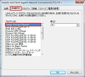 4. 「詳細設定」タブをクリックし、「プロパティ」欄の[Energy Efficient Ethernet]を選択します。